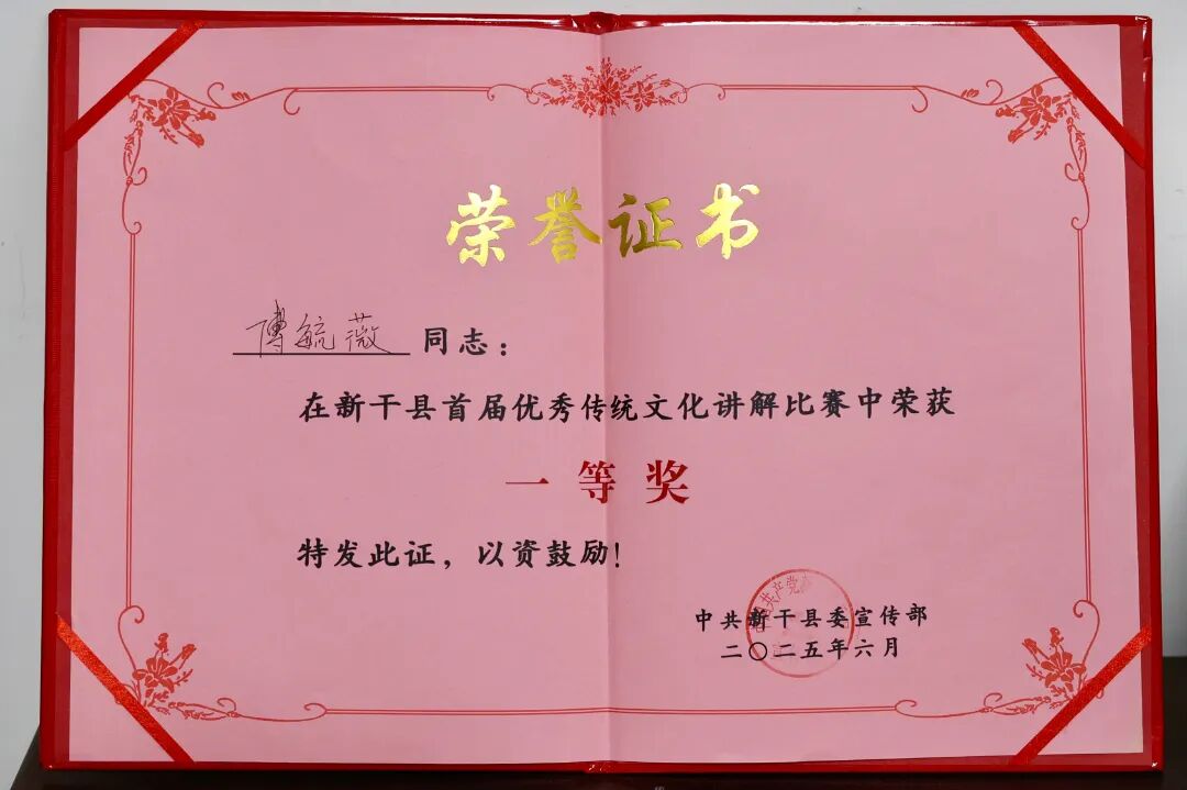 6月11日,中共新干县委宣传部主办的以“文化新干·古韵流芳”为主题的新干县首届优秀传统文化讲解比赛圆满落幕。我院青年干警傅毓薇在比赛中表现突出,成绩优异,斩获一等奖,展现了新干检察干警良好的精神风貌。