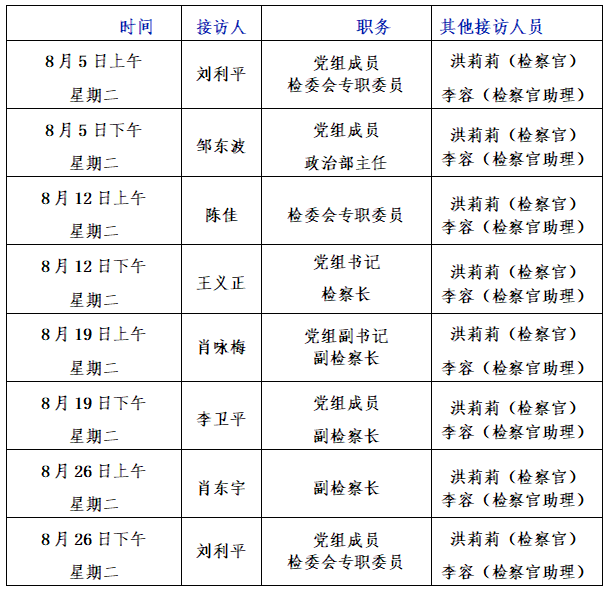 为认真贯彻习近平法治思想,全面生动展示新时代检察机关践行以人民为中心的发展思想情况,提升12309检察服务中心群众知晓度,提升12309检察服务中心服务质效,现将新干县人民检察院2025年8月份检察长接访日安排向全社会公告如下: