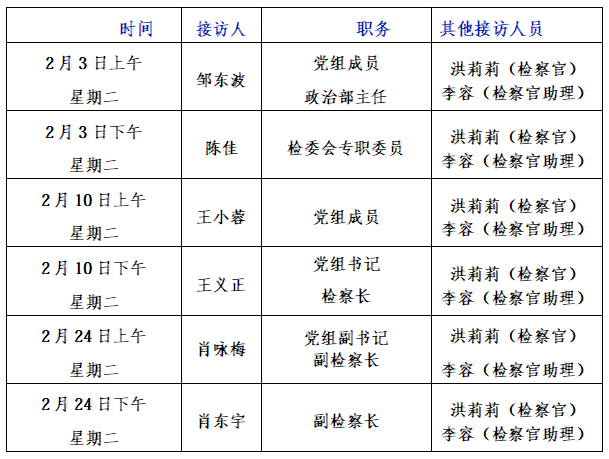 为认真贯彻习近平法治思想,全面生动展示新时代检察机关践行以人民为中心的发展思想情况,提升12309检察服务中心群众知晓度,提升12309检察服务中心服务质效,现将新干县人民检察院2026年2月份检察长接访日安排向全社会公告如下: