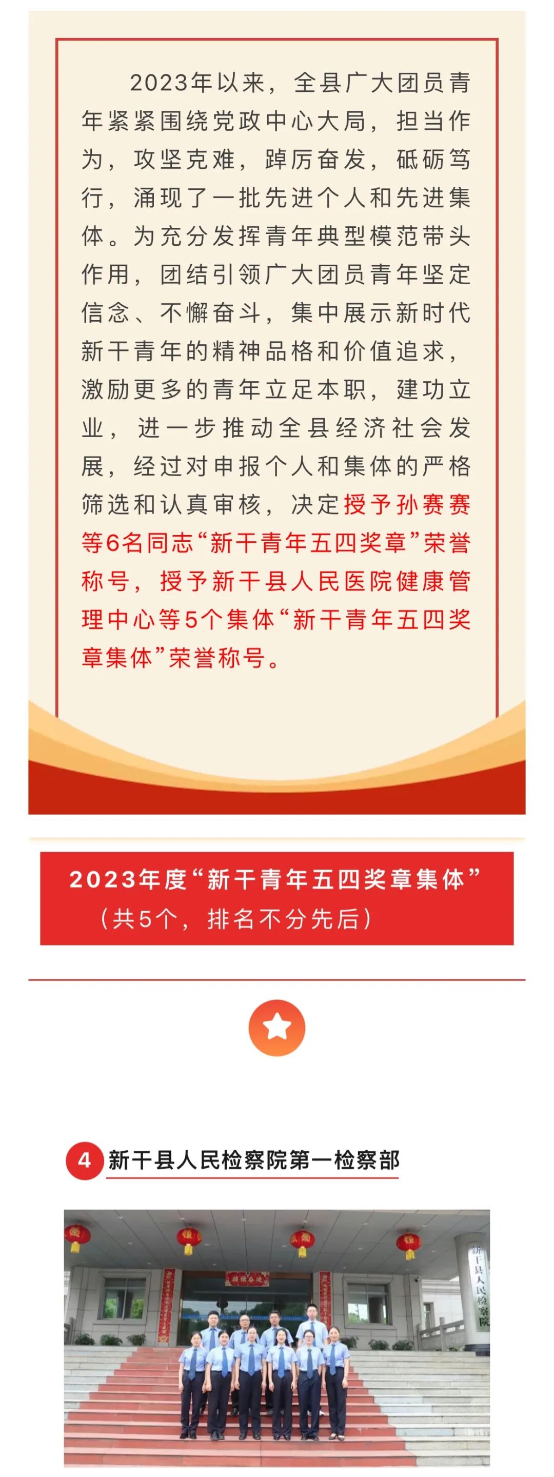 近日,新干县人民检察院第一检察部获评2023年度“新干青年五四奖章集体”荣誉称号。